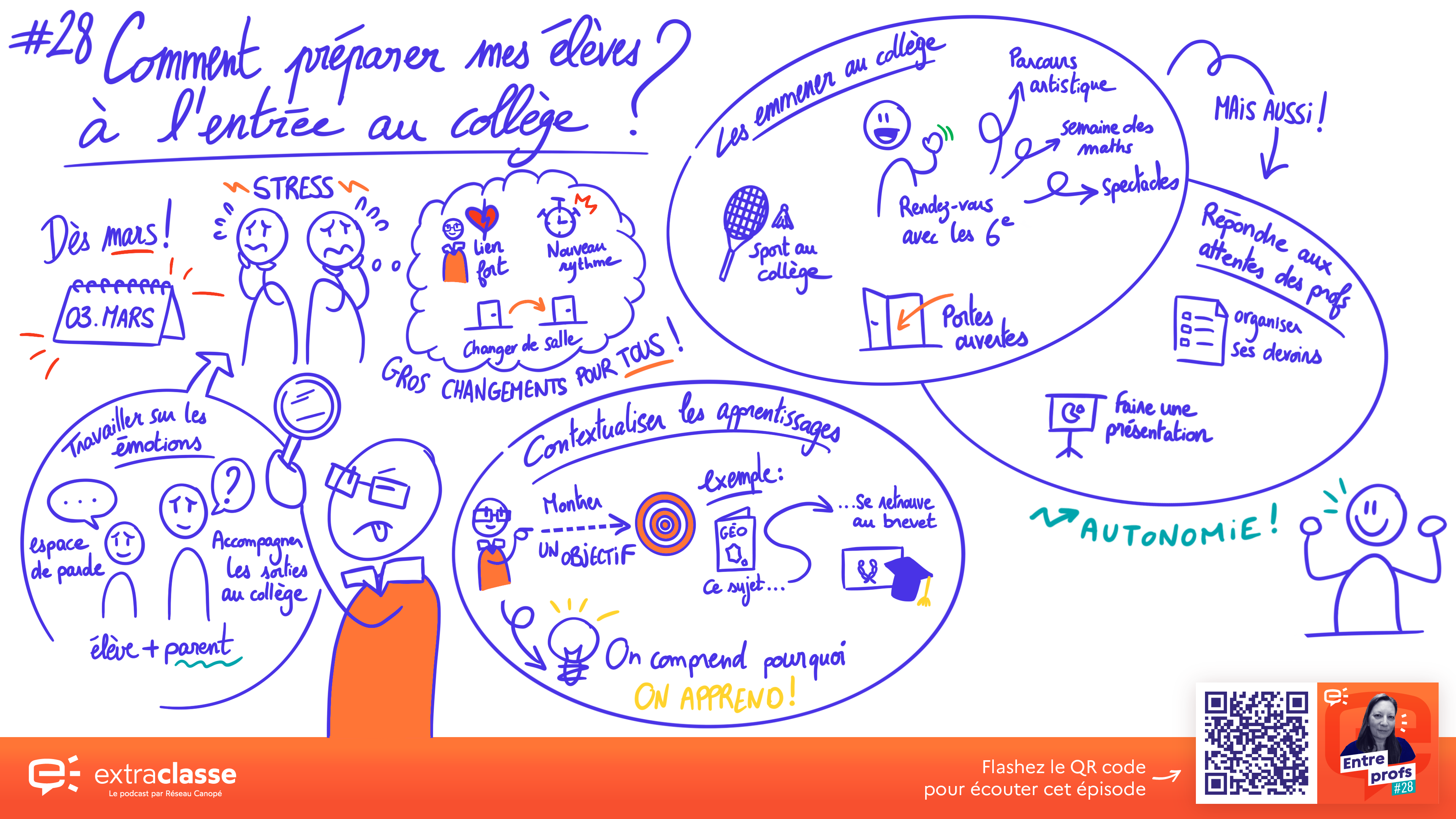 Frédérique FosséLa question arrive toujours au mois de mars où les élèves, on commence à les sentir un petit peu stressés parce que le passage au collège arrive vite. Ils prennent conscience qu'ils vont quitter le cocon de la maîtresse qu'ils connaissent. Il n'y en a qu'une. On a tissé des liens souvent assez forts entre nous. Et donc là, ils vont aller dans le grand bain, ils vont partir. Ce qui va vraiment changer : ce n'est pas le même lieu, le rythme de la journée va complètement changer, ils vont devoir changer toutes les heures de salle. J'ai pu remarquer que c'est un gros changement, que l'élève soit un bon élève ou pour les élèves en difficulté. Et donc, pour les préparer à ça, on les emmène le plus souvent possible au collège pour pratiquer le sport. Donc, on est dans les locaux du collège. On a de nombreux rendez-vous avec les sixièmes. Il y a le parcours artistique qui est en commun. Il y a la semaine des mathématiques, où il y a des ateliers qui sont proposés par les professeurs de maths et nous, professeurs des écoles. Il y a des spectacles en allemand. Il y a bien sûr la traditionnelle journée portes ouvertes, où ils circulent dans le collège pour qu'ils découvrent les différents lieux. Tout au long de l'année, quand j'aborde des nouveaux apprentissages ou quand on revoit des apprentissages qu'ils ont déjà vus dans les cycles précédents, je leur donne toujours un objectif plus lointain. Souvent, je prends même le brevet. Je leur dis : « L'année prochaine, les professeurs attendent que vous sachiez faire telle ou telle chose. Quand vous aurez cette question-là en géographie, c'est sûr, elle vaut deux points au brevet. Donc maintenant, on s'entraîne. Déjà, comme ça, ces deux points-là, ils sont gagnés. » J'ai un objectif lointain et comme ça, ils savent pourquoi ils apprennent. Du coup, ça les tranquillise aussi pour la 6e. Parce que je leur dis aussi que ce n'est pas si différent, c'est la continuité directe - la 6e fait partie du cycle 3 -, donc, il n'y a pas d'inquiétude à avoir par rapport à ça. Alors, on se voit très régulièrement avec les professeurs du collège, il y a même des professeurs de collège qui viennent travailler avec nous dans l'école. Et donc ça nous permet de discuter et d'être à l'écoute de leurs attentes. Après nous, on met en place par exemple les devoirs de toute la semaine le vendredi. Comme ça ils apprennent à s'organiser dans la semaine pour faire les devoirs au fur et à mesure. Ils doivent faire des exposés. Du coup nous en amont, pour les élections de délégués, on va leur demander de présenter leur programme sur un diaporama. Donc les rendre les plus autonomes, finalement, possible pour leur entrée en 6e. Il y aurait un troisième axe aussi très important, si ce n'est le plus important, c'est un travail sur les émotions des élèves, leurs ressentis. Donc leur offrir un espace de parole où ils peuvent déposer leurs craintes, leurs peurs, et qu'on puisse en discuter pour essayer de désamorcer un petit peu tout ça. Il y a aussi un travail sur les émotions des parents à faire, parce qu'eux aussi ont beaucoup d'attentes, mettent beaucoup de pression sur leur enfant. Pour cela, ne pas hésiter à chaque fois qu'on se rend au collège à leur demander de venir accompagner. Ils viennent, il y en a 5, 6 qui viennent, ils accompagnent tous et ils voient aussi où ira leur enfant et comment ça se passe la vie au collège.